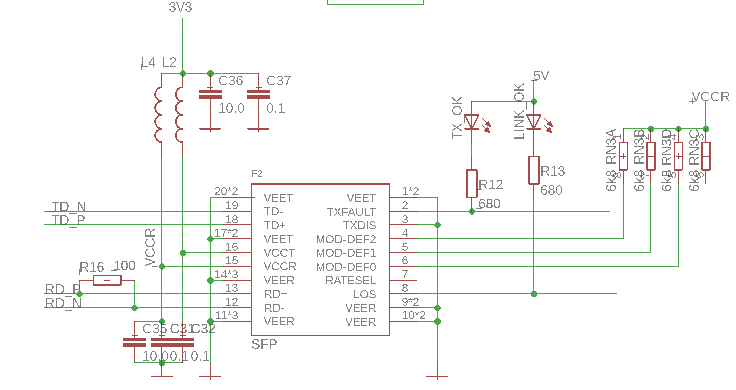 Inside SFP we can find laser driver for TX side and low noise amplifier for RX side. TX Fault is LOW (means TX is ON), LOS is LOW (means RX is fine). MODE DEF0...MOD DEF2 - pulled up with 6.8kOhm resistors to the +3.3V